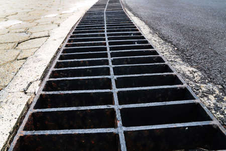 Mesh metal tool for the flow of water. Stormwater to drain water after rain. Means for draining water on the road. Streams flow into a hole in the asphalt