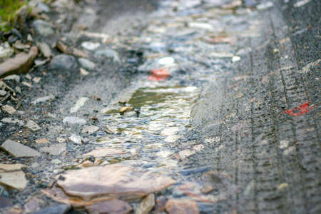 the current rainwater in the filled canal is a cement ditch of the drainage system on the side of a wet asphalt road after rain, close up with copy space.