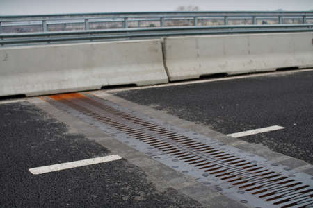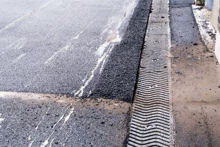 drainage system edge tray with concrete grate for rainwater drainage into the sewer on a road side after rain, close up nobody.