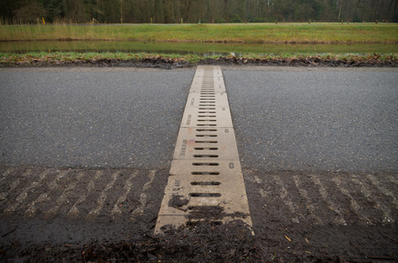 drainage system edge tray with concrete grate for rainwater drainage into the sewer on road with a yellow marking and a green lawn after rain.