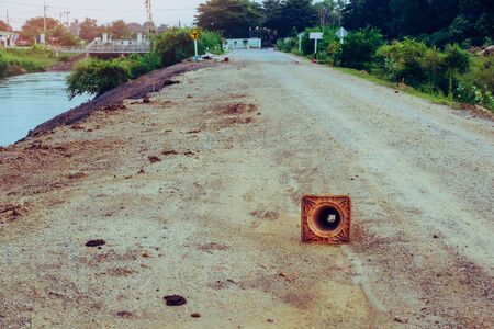 The old traffic cone falling on the road that was being repaired along the irrigation canal for agriculture.