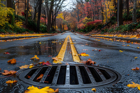flooded street well covered on yellow leaves