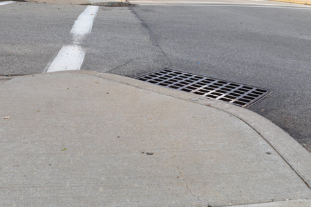 Low view of a street corner, sweeping concrete sidewalk, asphalt road and large metal grate over storm drain, horizontal aspect