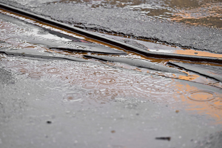 Detail shot with tramway track during rainfall