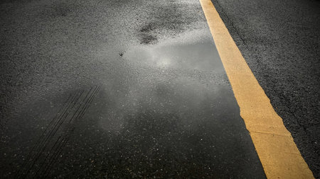 Asphalt road with yellow line and rain drop on asphalt surface.