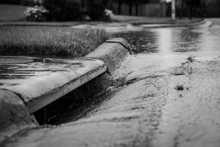Stormwater flowing into street intake drain after a rainstorm