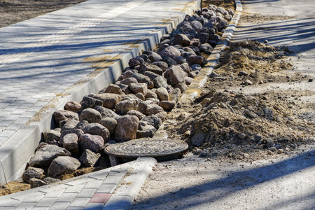 paving works of the street edge during the reconstruction of the street, cobblestone stack