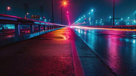 Capturing a vibrant highway scene at night, this image presents bright street lights and stunning light trails, reflecting the dynamic energy of urban life.