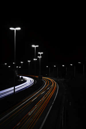 A long road stretches into the distance, illuminated by a series of streetlights under a night sky. The image captures the dynamic energy of motion with light trails of passing vehicles. The scene is characterized by a dark background and bright, artificial lights. Suitable for editorial and commercial use.