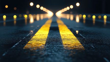 A captivating view of a wet road at night, showcasing vivid yellow traffic lines and sparkling city lights reflected on the asphalt. Perfect for urban themes.