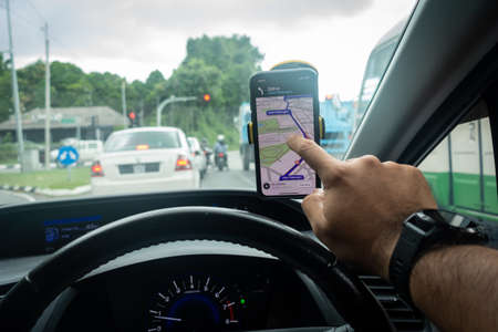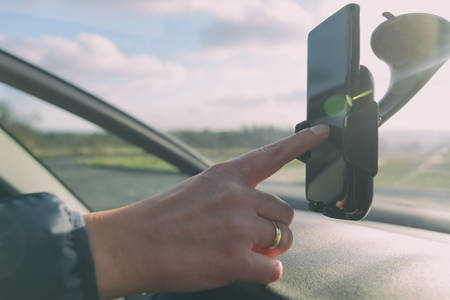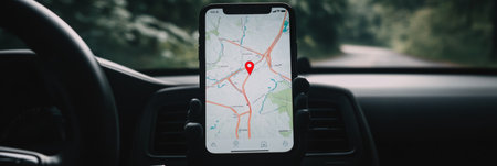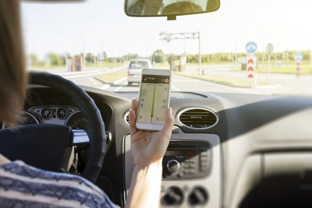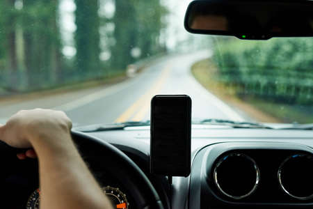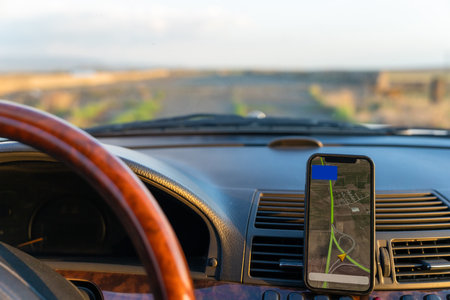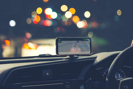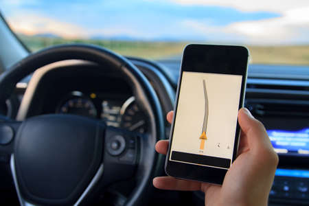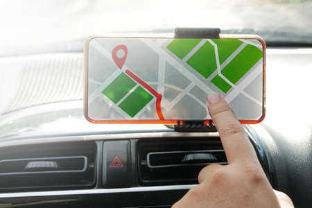 Navigation auto map system. Global positioning system on smartphone screen in auto car on travel road. GPS navigation with smartphone application system