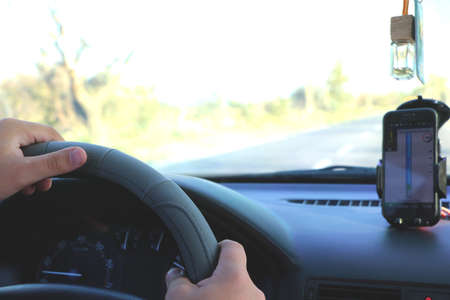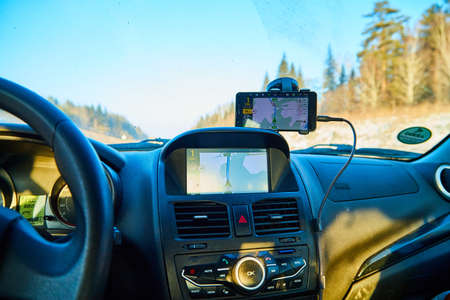 Navigator in the car on the road in a forest area, close-up.