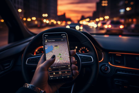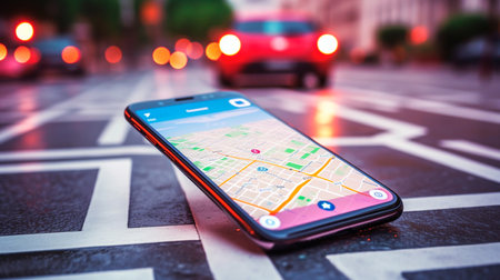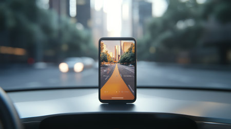 Modern smartphone displaying navigation app with augmented reality features, providing real time directions on car dashboard while driving through busy city streets