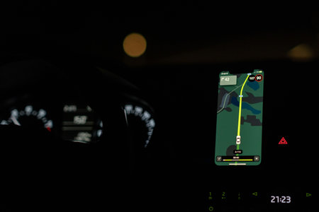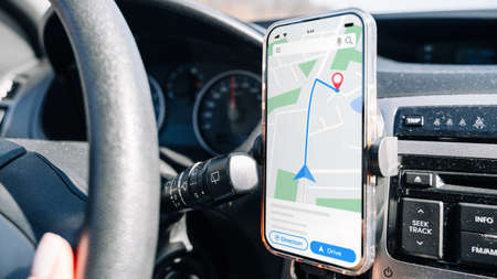 Wroclaw, Poland - April 17, 2022: Close-up of using GPS Navigation inside car