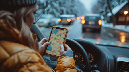 A young woman in winter clothing is attentively using a navigation app on her smartphone while driving in a traffic-jammed, snowy city.
