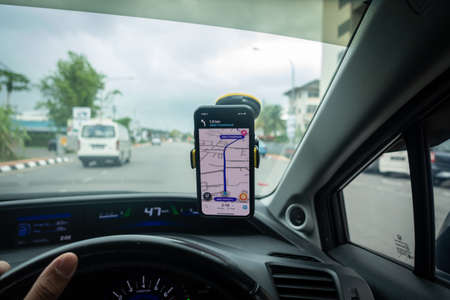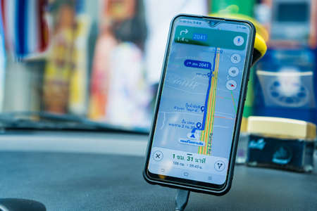 Bangkok Thailand- April, 03, 2021 : Google Maps navigation on smartphone in car. Google Maps is most popular mapping service for mobile provided by Google.