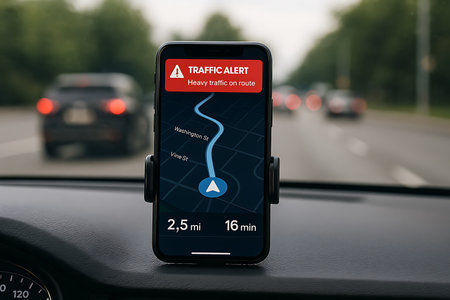 A smartphone, securely mounted on a car dashboard, shows a navigation application with a prominent red 'TRAFFIC ALERT' message indicating 'Heavy traffic on route'. The map on the screen displays a blue route with street names like Washington St and Vine St, alongside estimated distance (2.5 mi) and time (16 min). The background is blurred, depicting a busy road with other vehicles, emphasizing a real-time driving scenario and the challenges of urban commuting. This image highlights modern navigation technology, traffic management, and travel information.