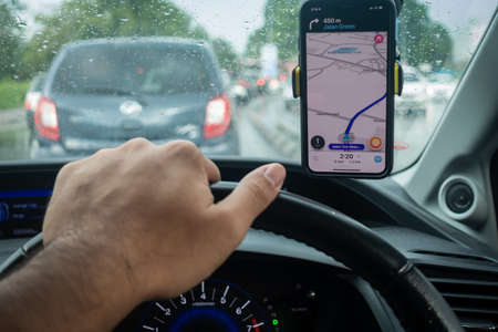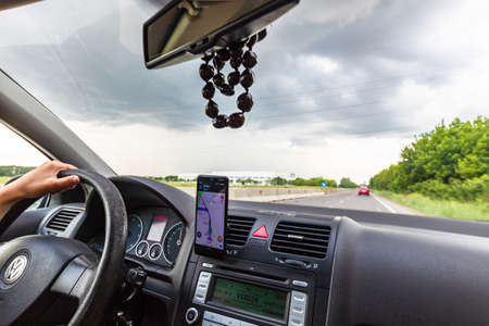 Driving and using waze maps application on smartphone on car dashboard, Driver using Waze maps app in Bucharest, Romania, 2021