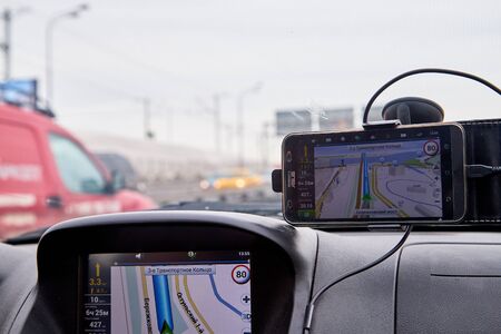 Moscow, Russia - March 13, 2018: Two navigation screens in the car during travel in Moscow