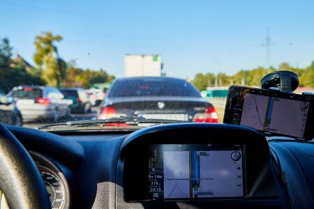 Nurnberg, Germany - June 22, 2017: Close-up of gps navigation system device in travelling car