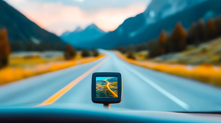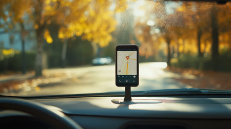 Displaying a gps navigation app on a smartphone positioned on a car dashboard, offering directions for an enjoyable autumn road trip through vibrant fall foliage and scenic landscapes