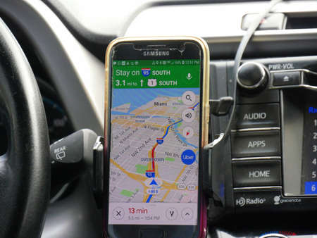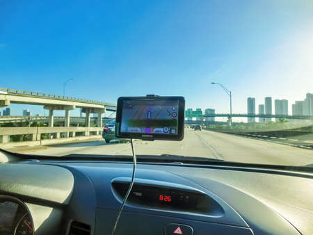 Miami, USA - November 29, 2019: The Navigation system in the car at Miami, USA