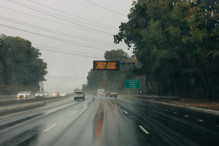 Vehicles navigate a wet highway while a warning sign alerts drivers of serious driving conditions ahead.