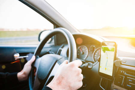 Man in the car and holding black mobile phone with map gps navigation, toned at sunset.