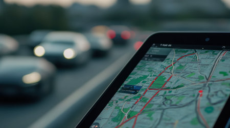A close-up view of a navigation map displayed on a device, showcasing a busy city road with traffic. Ideal for concepts of travel, technology, and navigation.