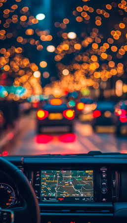 City Night Drive Dashboard View of GPS Navigation with City Lights Blur. Festive Bokeh Effect.