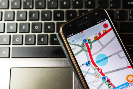 In car dashboard view with smartphone showing Police on Waze maps. Driver using Waze maps in Bucharest, Romania, 2020