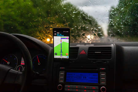 Using waze maps application on smartphone on car dashboard, Driver using maps app for showing the right route through the traffic of city on a rainy evening. Bucharest, Romania, 2020.