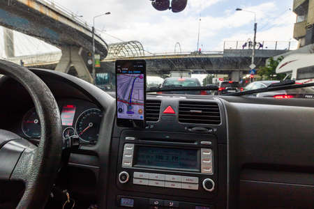 Using waze maps application on smartphone on car dashboard, Driver using maps app for showing the right route through the traffic of city at sunset on a rainy evening. Bucharest, Romania, 2020.