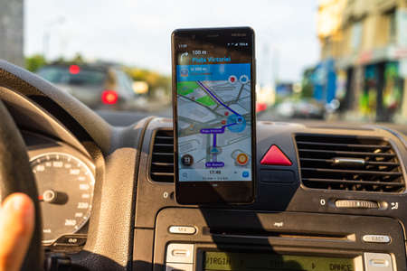 Using waze maps application on smartphone in car dashboard. Driver using maps app for showing the right route through the traffic in Bucharest, Romania, 2021