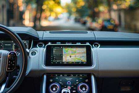 Detailed view of a Range Rovers dashboard featuring a navigation system, steering wheel, vehicle audio, and automotive mirror