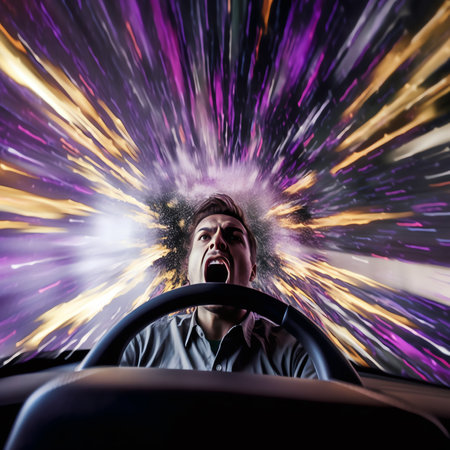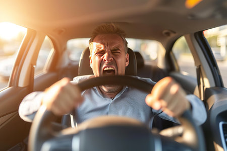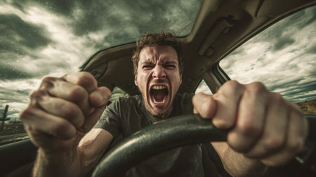 A man clenches his fists around the steering wheel, his expression tense and angry, as dark clouds loom outside, portraying a moment of intense road frustration.