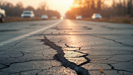 A close-up view of a cracked road surface illustrating the impact of natural disaster, with faded vehicles and a blurred forest backdrop, symbolizing environmental changes.