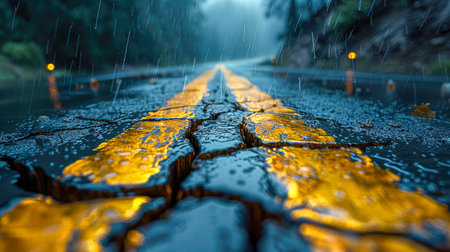 This close-up photograph captures the wet surface of an asphalt road with vivid yellow markings under low light. The intricate texture and details create a moody atmosphere, perfect for various creative uses.