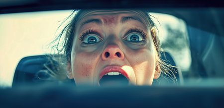 GPT A woman stares out of a car windshield with wide, fearful eyes, illuminated by dramatic blue and green lighting. Blurred city lights add a tense atmosphere. High quality photo