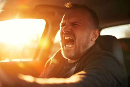 Frustrated man grips steering wheel while driving, his face tense and lit by golden hour light, expressing road rage or stress.