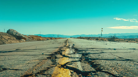 A deep crack splits a long desert highway, a stark reminder of a powerful disruption.