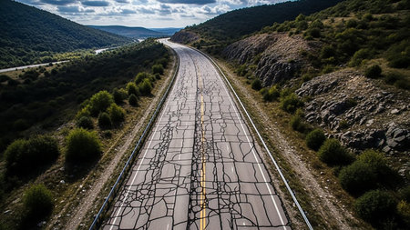 An aerial perspective a cracked asphalt road winding through green, hilly terrain under a dramatic, cloudy sky.