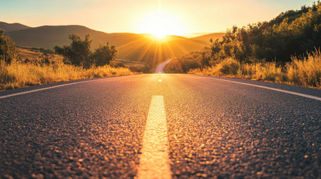 An asphalt road extends into the distance, framed by hills and illuminated by a setting sun. The composition features a low-angle perspective, highlighting the road's texture and the natural gradient of the sky. The warm colors suggest a tranquil outdoor setting, suitable for commercial or editorial applications.