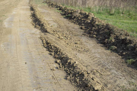 Traces of a bulldozer in the sand. The construction site is rammed with machinery.