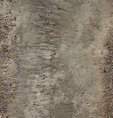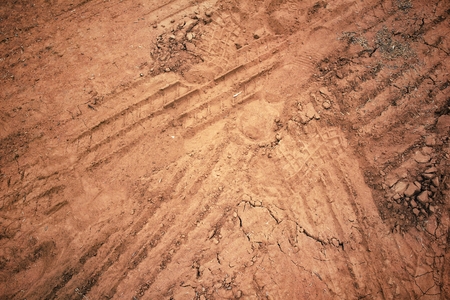 The texture of the track car. Brown earth close-up view from above. natural design. Tire tracks on the ground. Autumn abstract natural ochre background. Layout for text, texture of clay stones sand