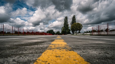 Captivating view of an empty highway featuring a yellow lane marking, framed by lush greenery and a dramatic cloudy sky in a tranquil urban setting.