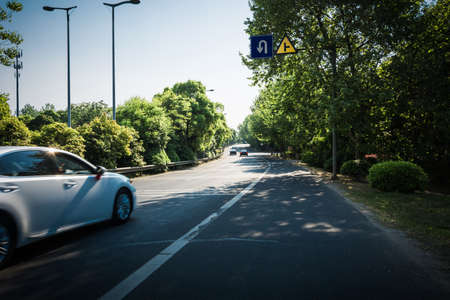 The special unit zoomed quickly to open the siren, driving along the highway. Abstract blur. controls the van on the highway.