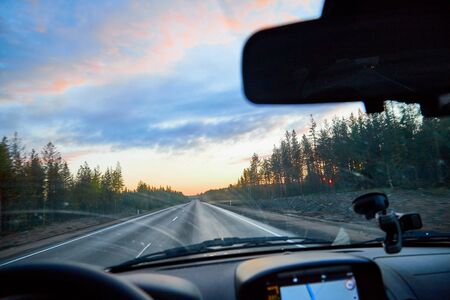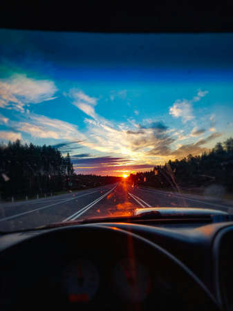 Red sunset view with shining sun from the car front window. Driving car during sunset concept. View on nature landscape and a road from car cabin in the morning or evening