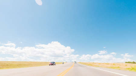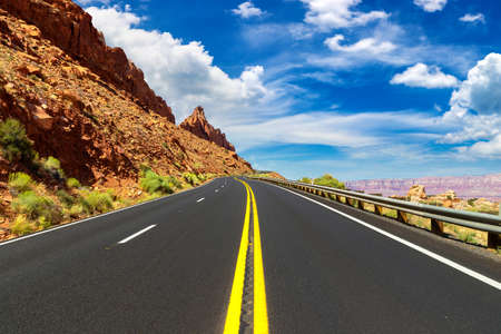 Natural american landscape with asphalt way to horizon. Panoramic picture of a scenic road, USA. Endless straight, Route 66.