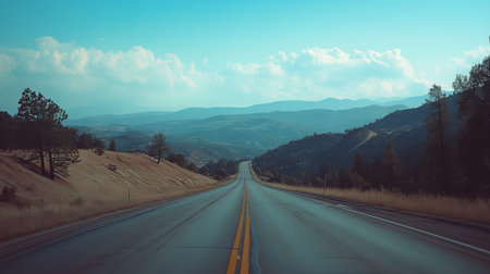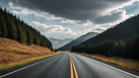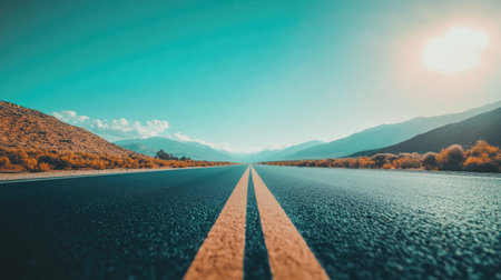 Captivating view of a long highway leading towards stunning mountains, with warm sunlight illuminating the scene, inviting adventure and exploration amid nature's tranquility.